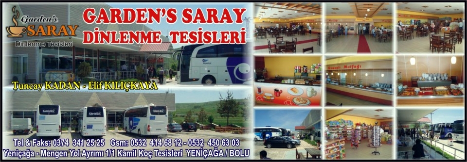 Seyahatleriniz sırasında verdiğiniz molalarda,hoşça vakit geçirmenizi amaçlayan Garden's SARAY Dinlenme Tesisleri;geniş kapasiteli restoranıyla hizmetinizdedir.Zonguldak-Bartın karayolu'nun 1.km'sinde bulunan tesisimiz ferah atmosferiyle yol yorgunluğunuzu kısacık molalarda bile unutmanızı sağlayacaktır.Tamamen hijyenik koşullarda faaliyet gösteren restoranımızda;usta aşçılarımızın hazırladığı yemekler,Türk mutfağının geniş yelpazesini göz önüne sermektedir.